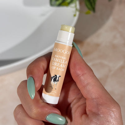 Edible Lip Balm 5g - Vanilla Dream MooGoo Vanilla Dream Lip Balm boxed packaging on clean backdrop, natural moisturising lip balm for dry chapped lips made with edible safe ingredients, petroleum free, all natural.